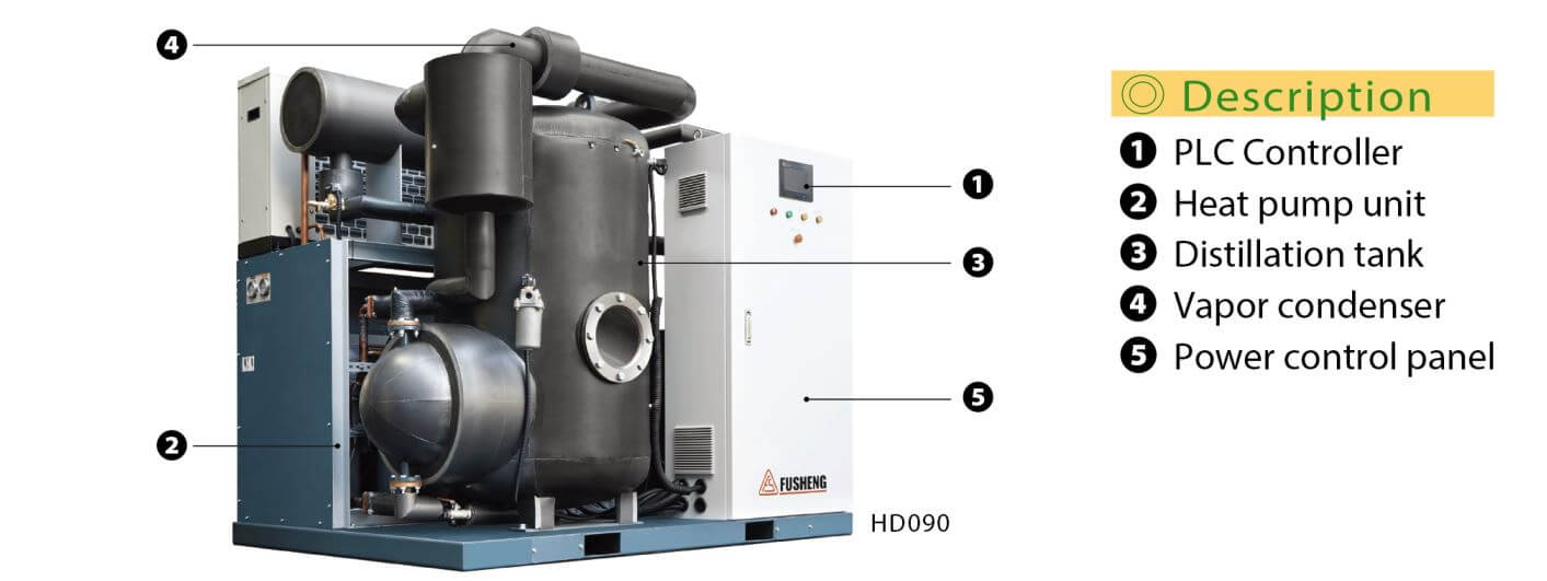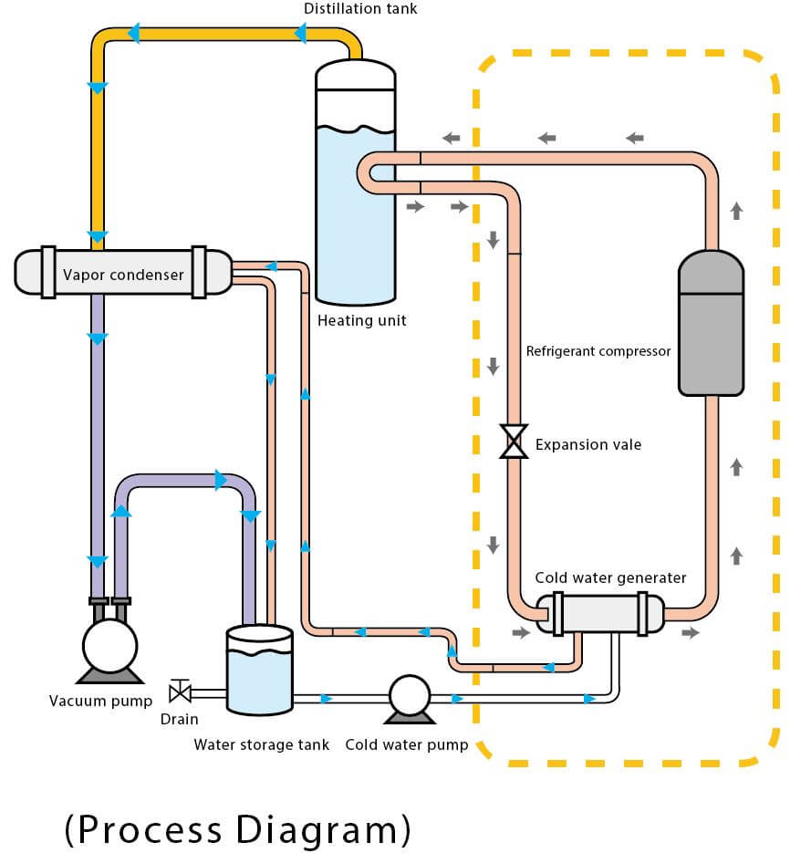 - After feeding wastewater into the tank, the process of distillation could be started. Heat produced by the heat pump is transferred to the distillation tank. Since the tank is kept in vacuum condition by a vacuum pump, the water inside would boil at 40-60℃. The vapor would then condensed into cold water.
