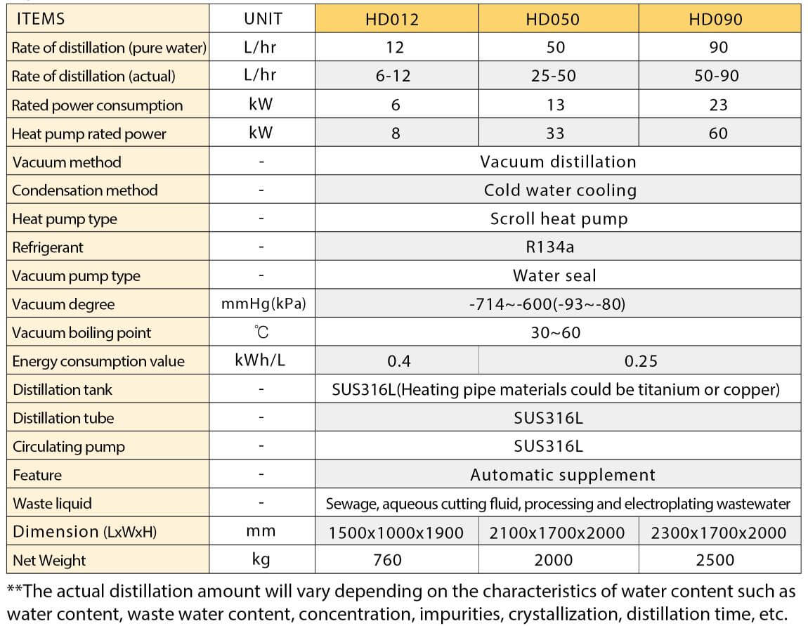 The high-efficiency scroll heat pump compressor can process wastewater ranging from 200 liters to 2000 liters per day, depending on different modes of the machine. With vacuum distillation technology, water will be boiled at 40-60 degrees. It means that one liter of processing fee is less than one NTD, greatly reducing the energy consumption during use. The building area of this equipment is small, both the efficience to enhance corporate image and reduce corporate costs, creating a value target of economic and environmental co-prosperity.